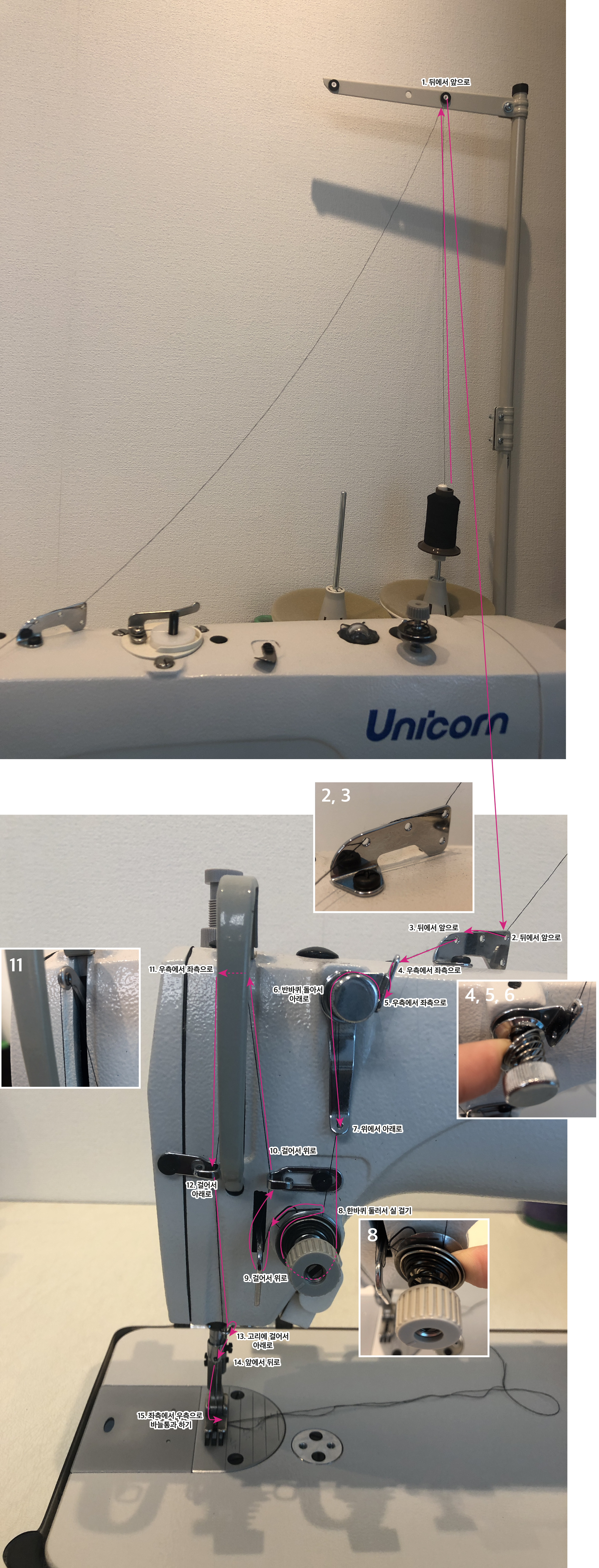 1. 공업용 미싱 유니콘 "LS2-H515-D"의 실 꿰는 순서