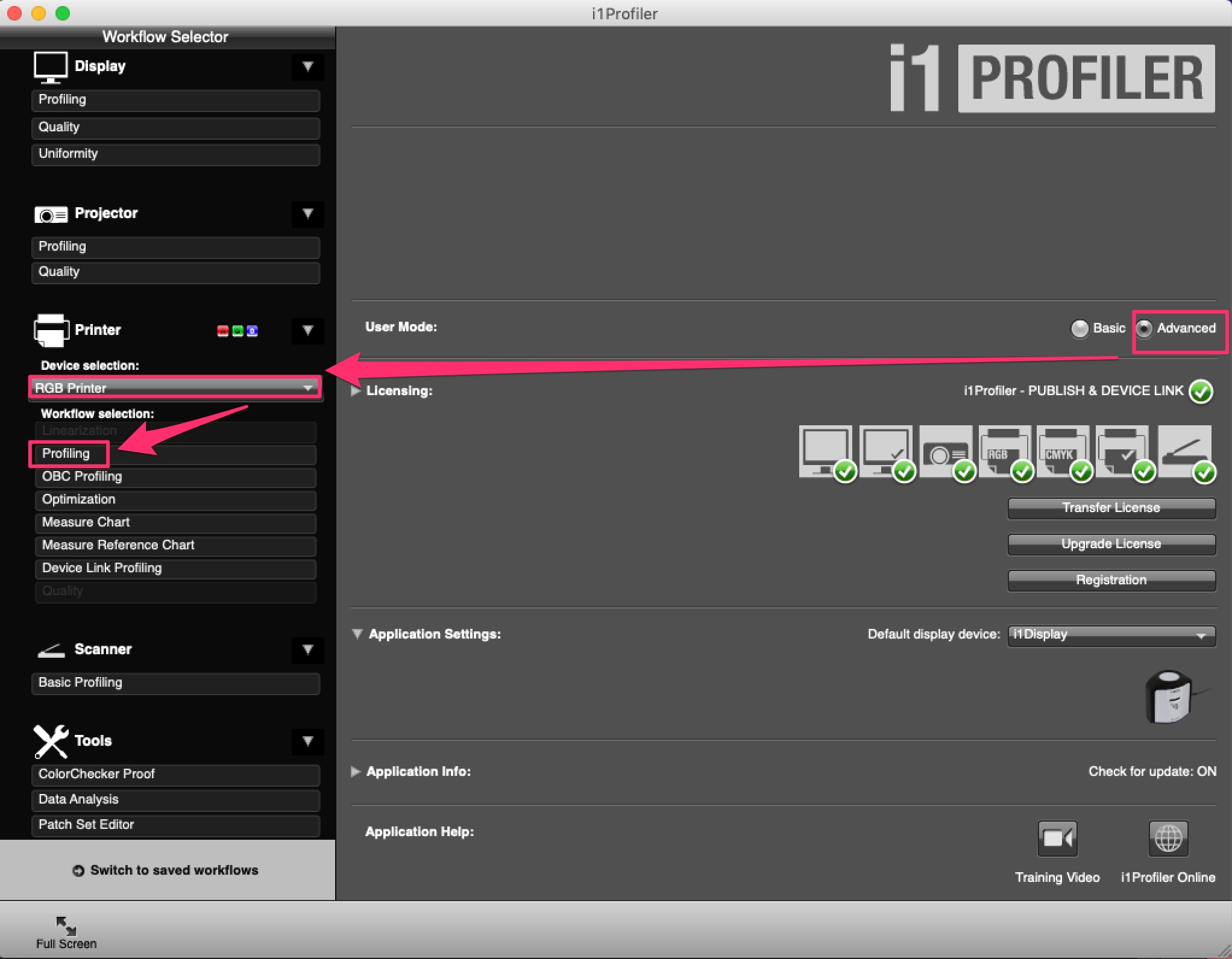 Advanced 클릭 후, Device Selection에서 프린터(CMYK or RGB etc.)를 선택한 후 Profiling 선택한다.